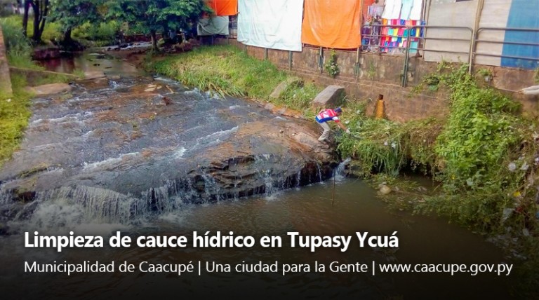 Integrantes del Departamento de Aseo Urbano de la Municipalidad de Caacupé realizan trabajos de limpieza de cauce hídrico en...