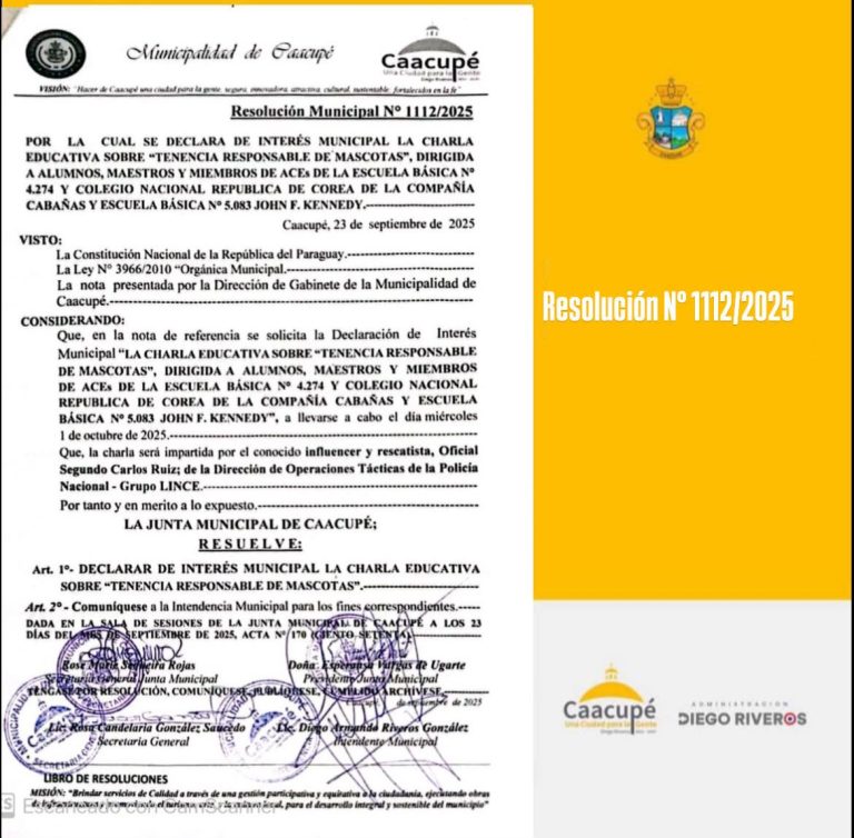La Municipalidad de Caacupé, mediante la Resolución N° 1112/2025, declara de Interés Municipal la Charla Educativa sobre “Tenencia Responsable de...