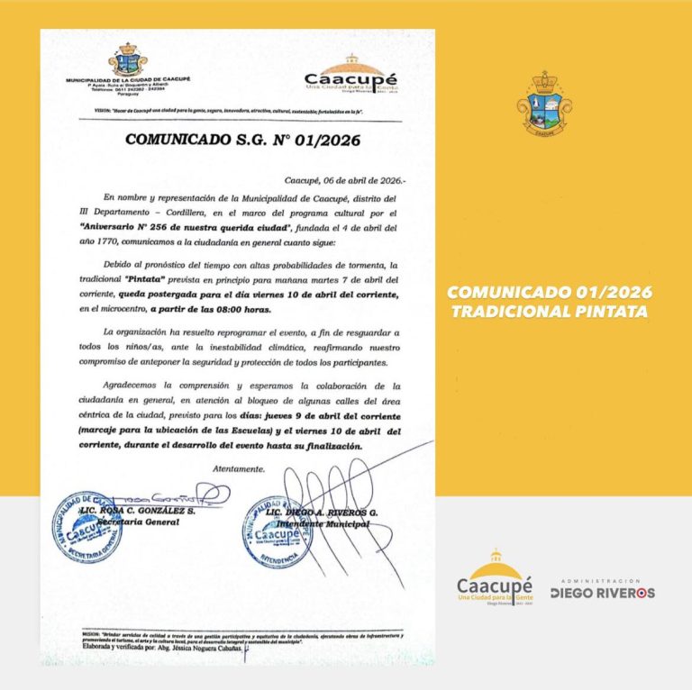 La Municipalidad de Caacupé informa a la ciudadanía que, debido a las altas probabilidades de tormentas previstas, la tradicional Pintata,...