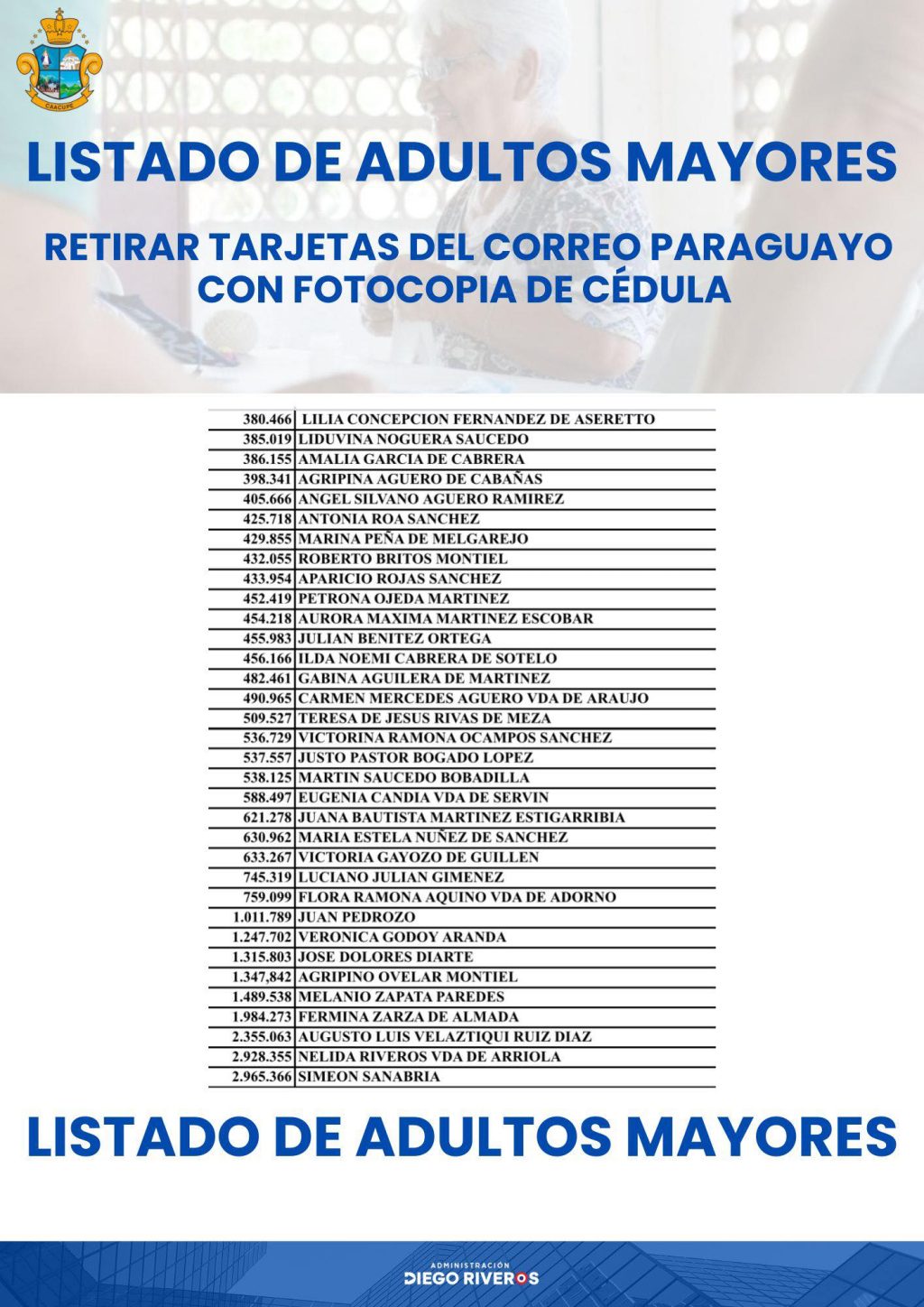Ya se encuentra disponible el listado de beneficiarios que deben retirar sus tarjetas en el Correo Paraguayo, en horario de 07:00 a 13:00 hs, presentando una fotocopia de cédula.