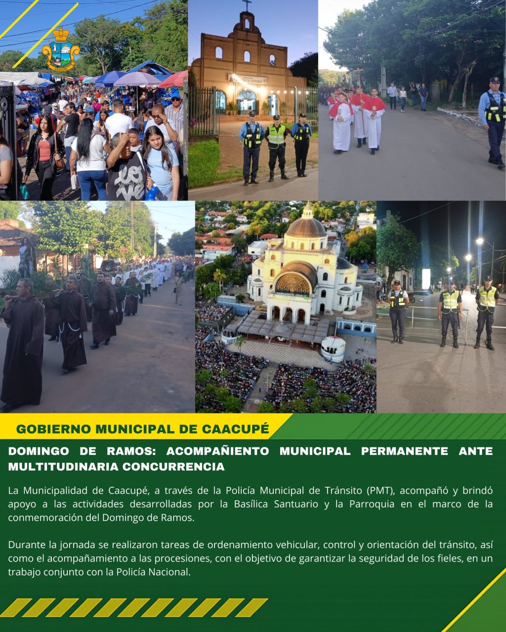 La Municipalidad de Caacupé, a través de la Policía Municipal de Tránsito (PMT), acompañó y brindó apoyo a las actividades desarrolladas por la Basílica Santuario y la Parroquia en el marco de la conmemoración del Domingo de Ramos.