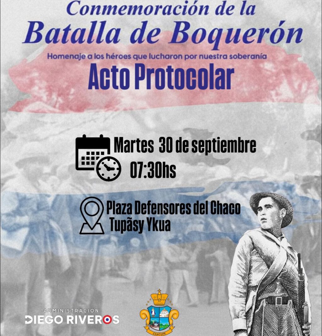 Intendencia En conmemoración de la Batalla de Boquerón, rendimos homenaje a los héroes que lucharon por nuestra soberanía. Te invitamos a participar del Acto Protocolar: Martes 30 de septiembre 07:30 hs Plaza Defensores del Chaco – Tupãsy Ykua Acompañemos juntos este momento de memoria y gratitud hacia quienes dieron todo por la patria. Deja tu opinión sobre esto Navegación de entradas Anterior Batalla de BoquerónSiguente ¡Orgullo total!