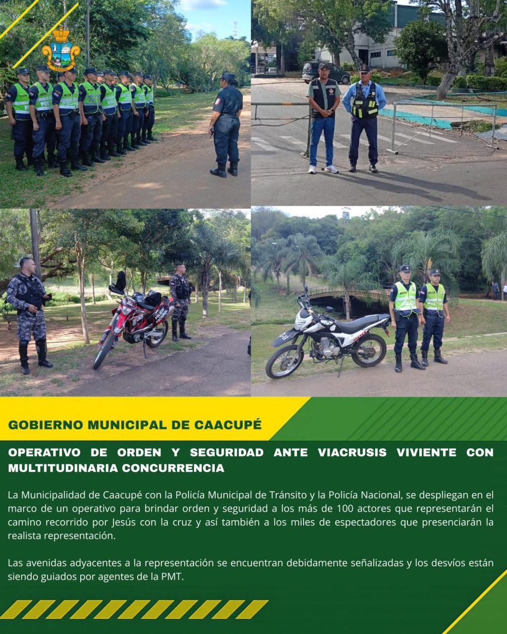 La Municipalidad de Caacupé con la Policía Municipal de Tránsito y la Policía Nacional, se despliegan en el marco de un operativo para brindar orden y seguridad a los más de 100 actores que representarán el camino recorrido por Jesús con la cruz y así también a los miles de espectadores que presenciarán la realista representación.