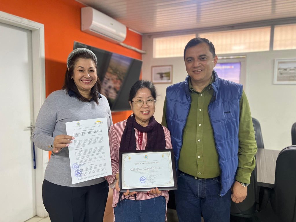 Hoy hicimos entrega de un certificado y una resolución de reconocimiento a Mi Yeon Joug (Clara), voluntaria de KOICA, quien estuvo colaborando en la Escuela San Miguel Arcángel y está culminando su misión en Caacupé para regresar a su país natal. 🇰🇷🤝🇵🇾